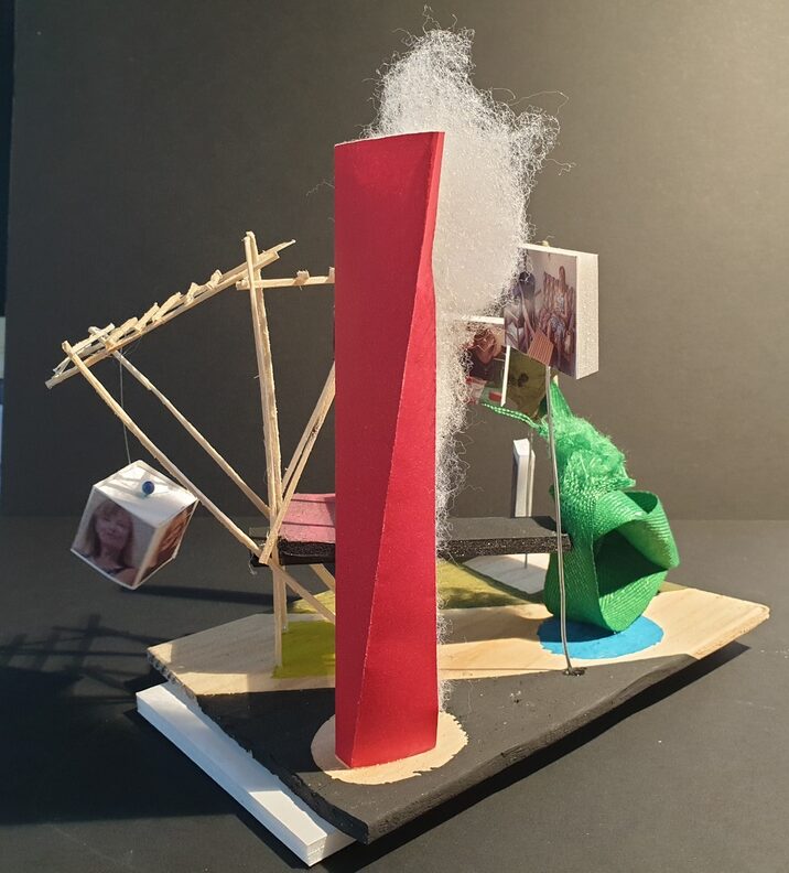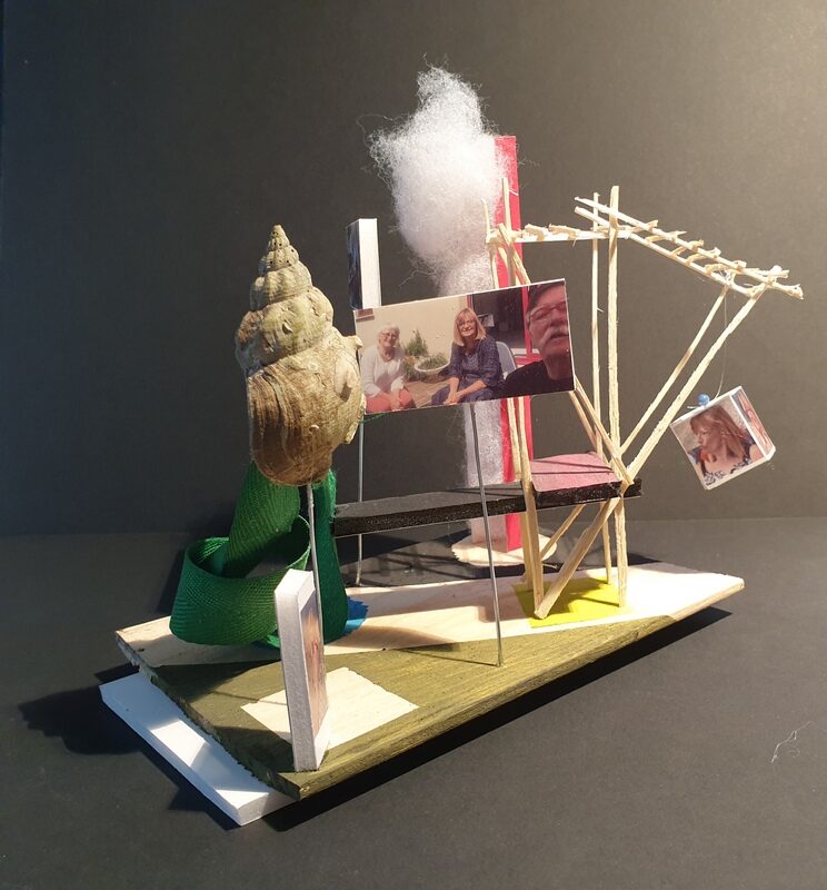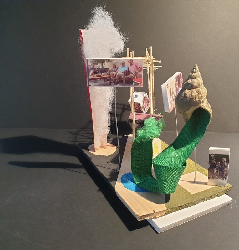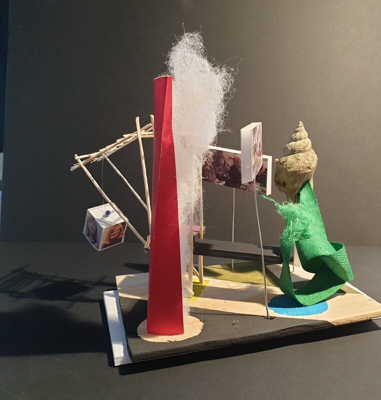 Dans blanc, bleu, carton, coquillage, couleurs, fil de fer, jaune, matières, mousse, noir, nuage, resille, rouge, tout, vegetaux, vert