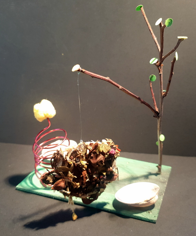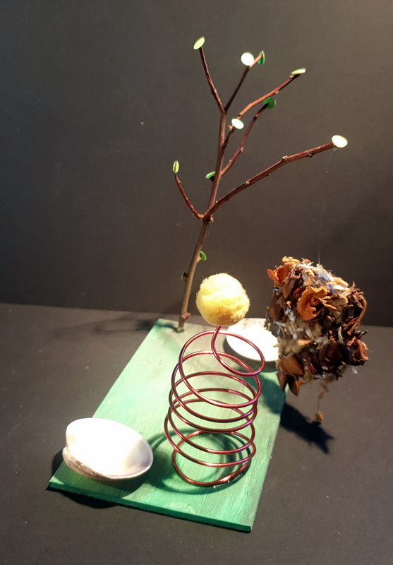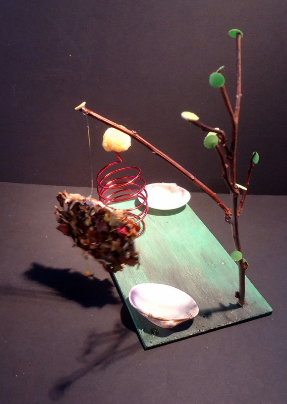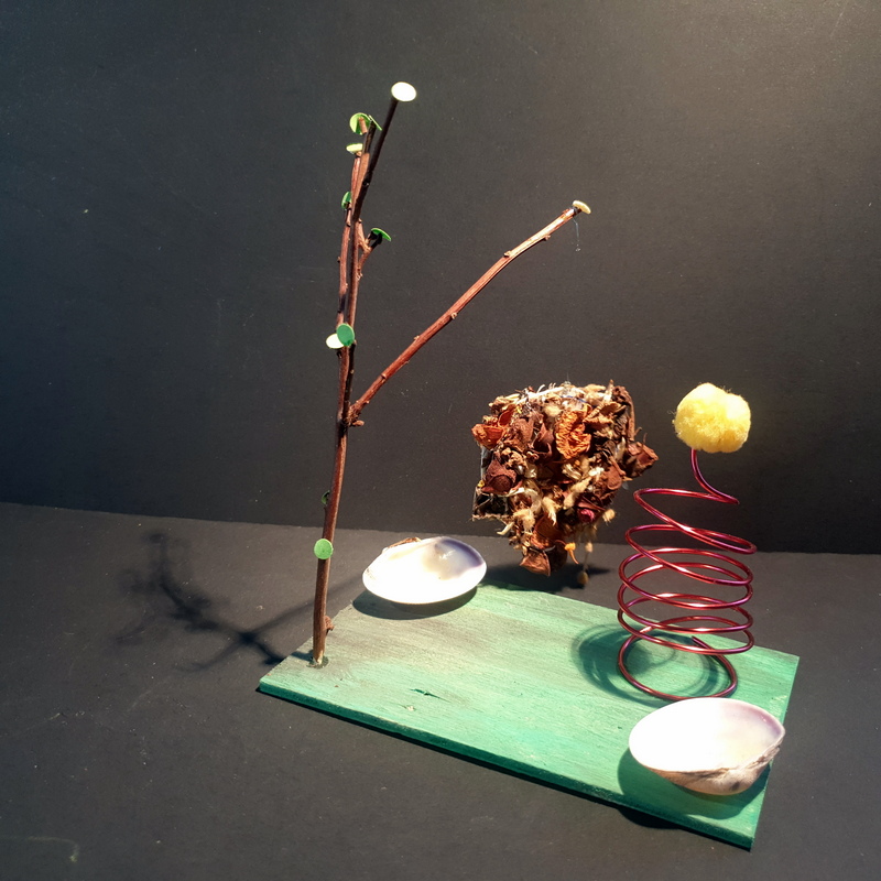 Dans blanc, coquillage, couleurs, ficelle, fil de fer, gris, jaune, matières, orange, rouge, tout, vegetaux, vert