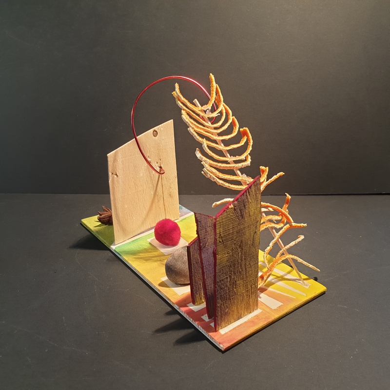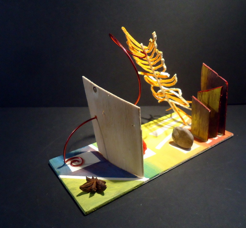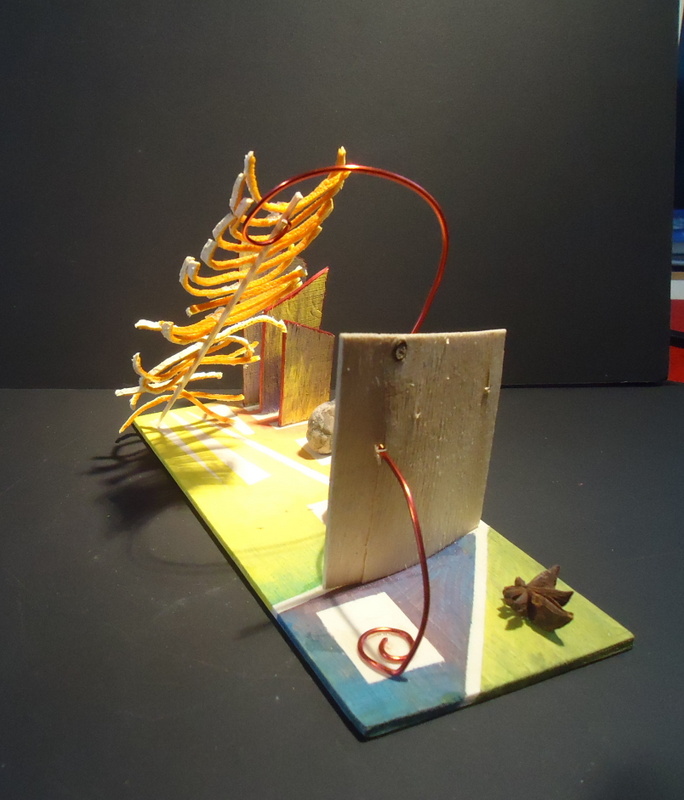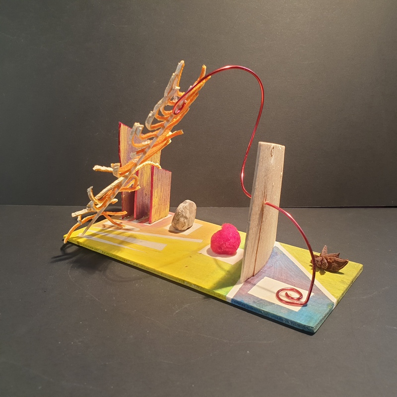 Dans bleu, caillou, carton, couleurs, fil de fer, jaune, matières, orange, resille, rouge, tout, vegetaux, vert