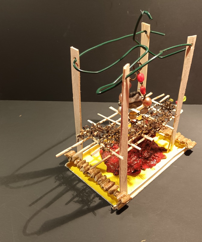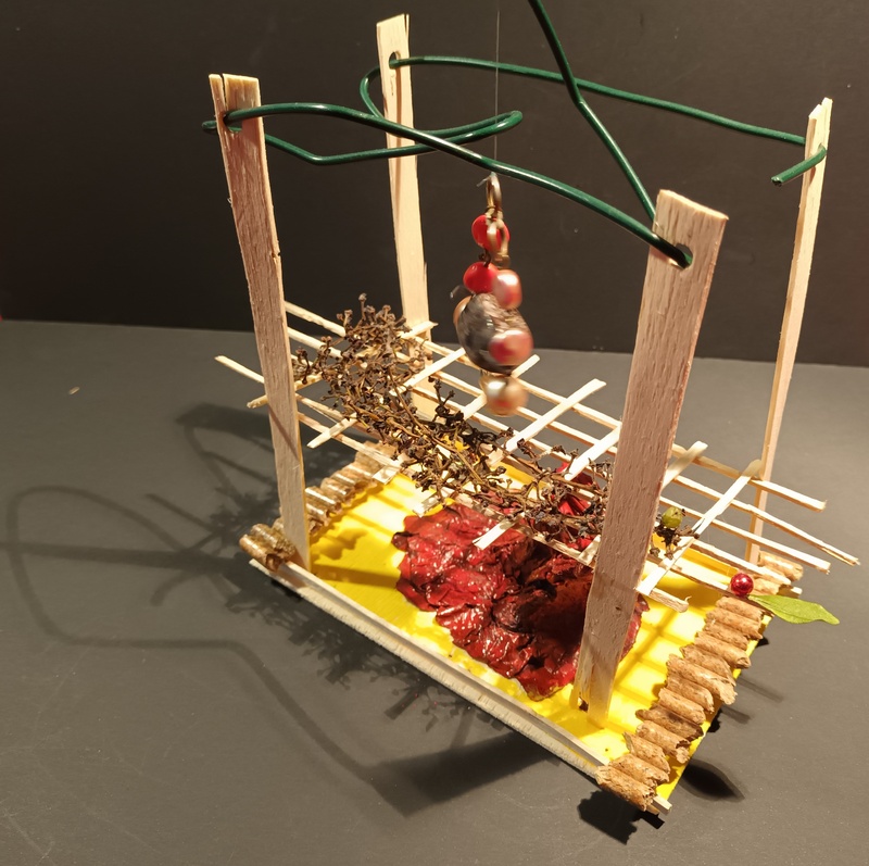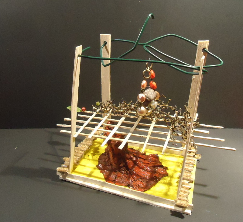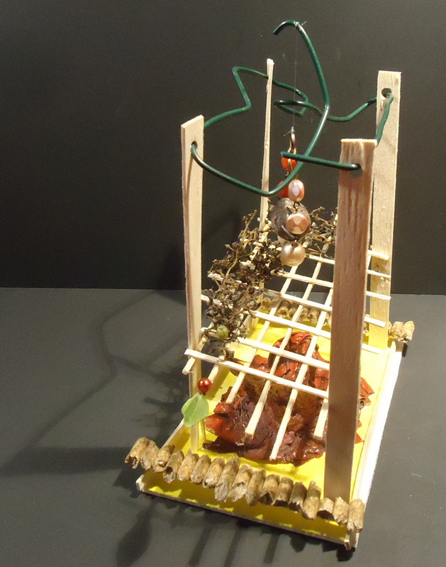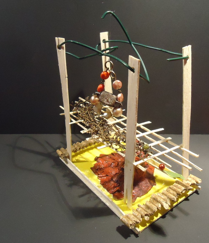 Dans blanc, caillou, carton, couleurs, fil de fer, gris, jaune, matières, noir, orange, papier, rouge, tout, vegetaux, verre